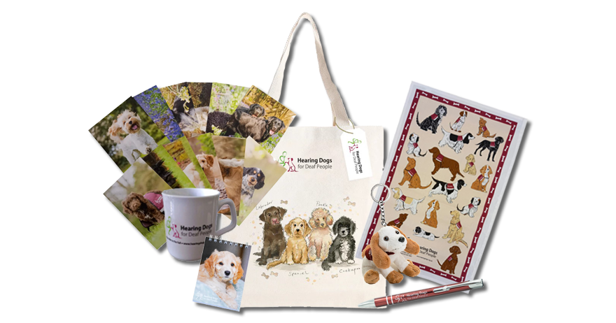 Five Hearing Dog goodie bundles. Each bundle comprises of one each of the following: Tote Bag (4 dogs design); Hearing Dogs Tea-Towel, Hearing Dogs Mug, Hearing Dogs 12 Assorted Cards Pack; Hearing Dogs Mini Notepad; Hearing Dogs Burgundy Pen; Hearing Dogs Jax Keyring.