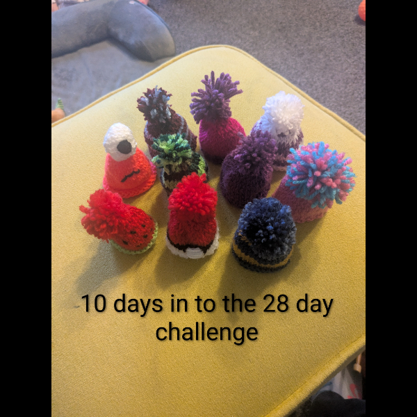Sunday 25th Jan I'm going to knit a mini bobble hat a day to raise money for the hearing dogs 28 day challenge. (Innocent smoothie bottle top style bobble hat)Thank you to my Sponsors