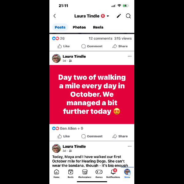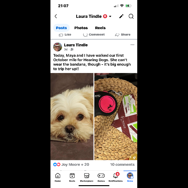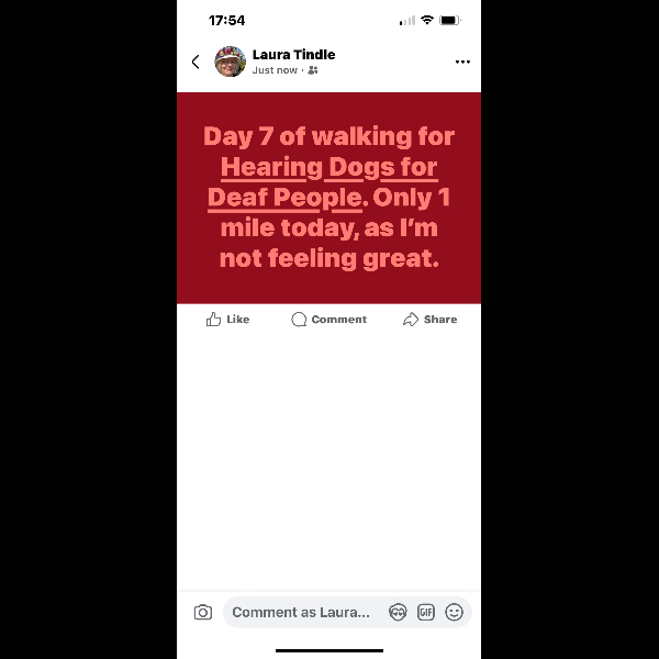 Wednesday 24th Sep Soon it will be time to start walking with Maya to raise funds for Hearing Dogs for the Deaf. I’m doing this because I have seen how important a hearing dog can be for a deaf person. The bond and partnership between deaf person and their dog is life-changing! Please donate to support my effort. Whether you can give a small or large amount - every penny helps.Thank you to my Sponsors