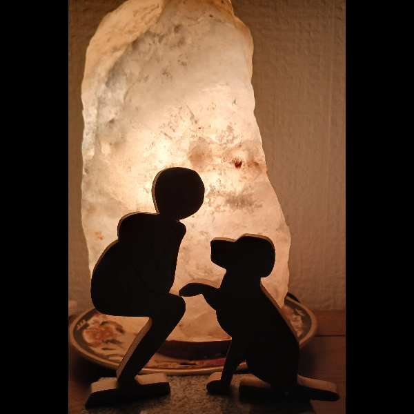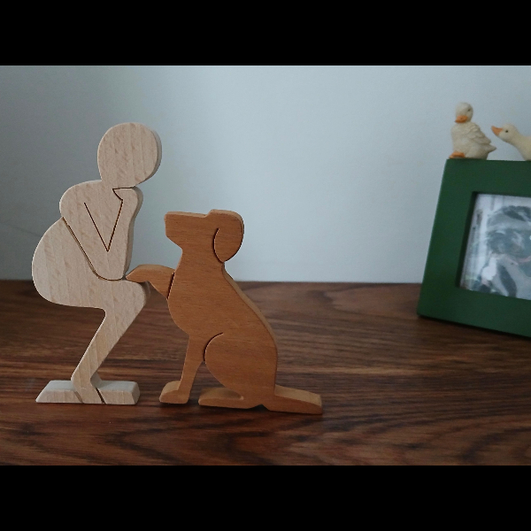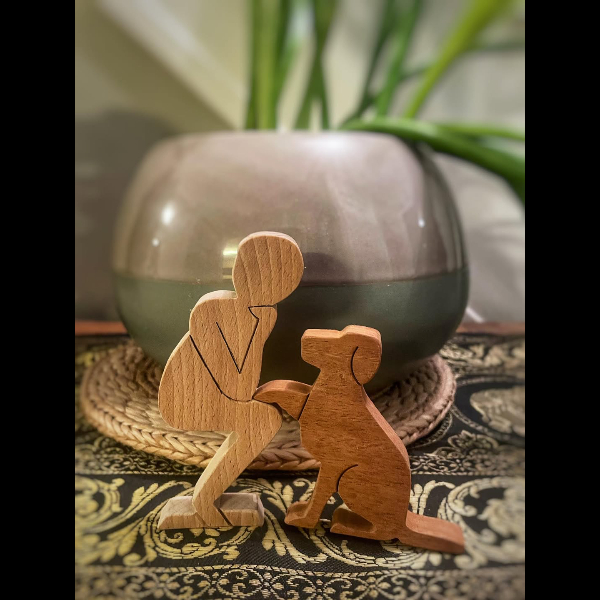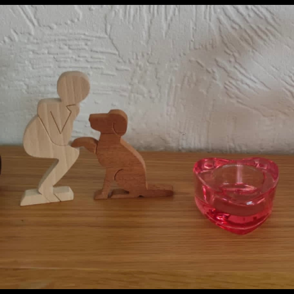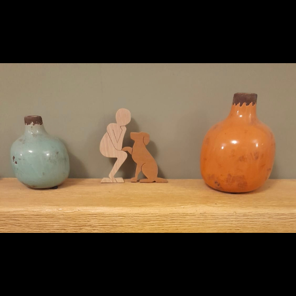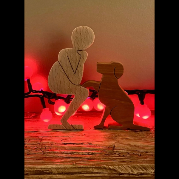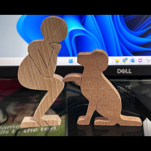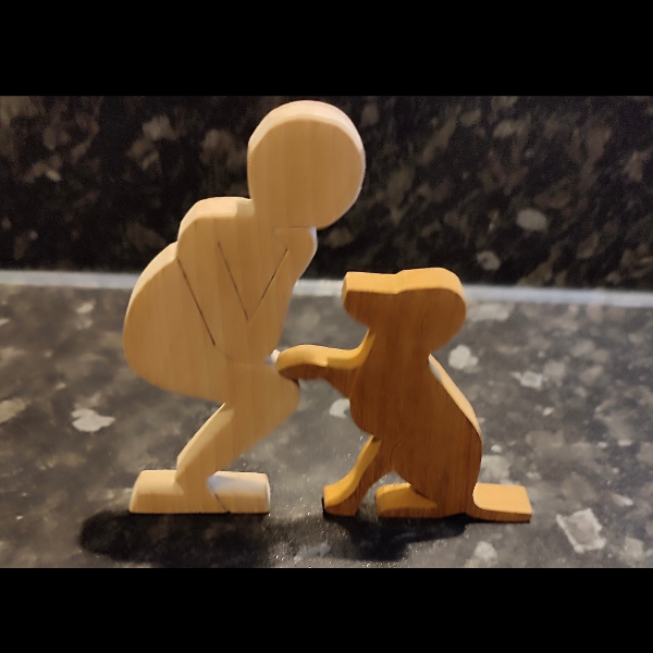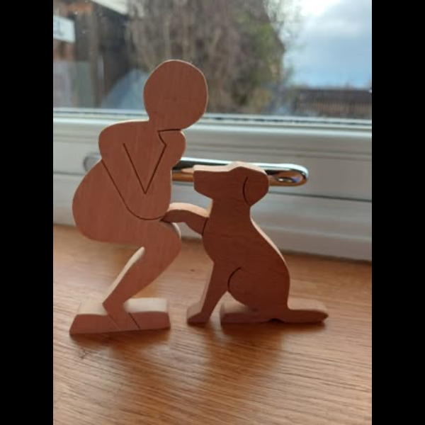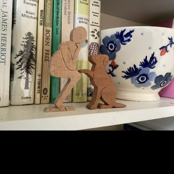 Bring the Hearing Dog logo to life with this wooden ornament, which I’m making for the 28 Challenge. It is made out of recycled hardwoods. The beech figure (105mm high) is crafted from old broken school desk lids, and the dog (75mm high) is cut out of sapele door frames that were destined for the skip. The figures look good gracing a mantelpiece, window sill, or shelf.